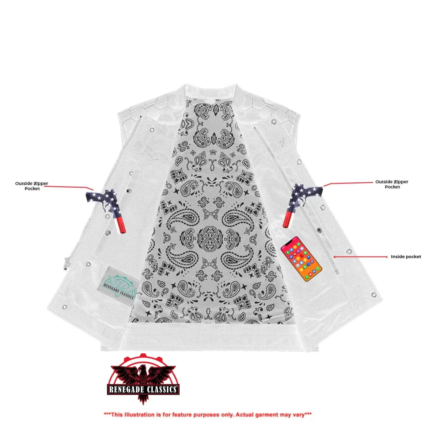 Our Cold Burn Black and Blue Mesh Textile Vest features a durable mesh construction with vibrant black accents. It includes concealed carry and secure chest pockets with snap button closures for convenience. The hidden front zipper with snap-placket reinforced stitching and built-in hanging loop adds to its practicality and style. This vest is perfect for those who want a striking, functional Vest to match their riding styles.