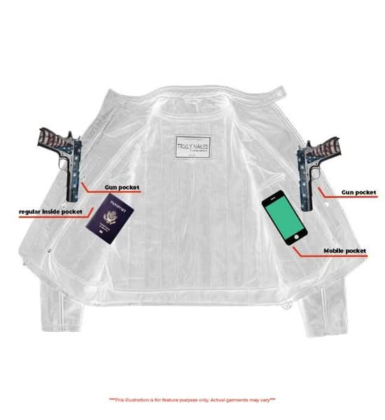 - 1 inside left-hand side concealed Smart Access Pocket made of special heavy-duty textile with built-in holsters and snap closure and 1 regular inside pocket.