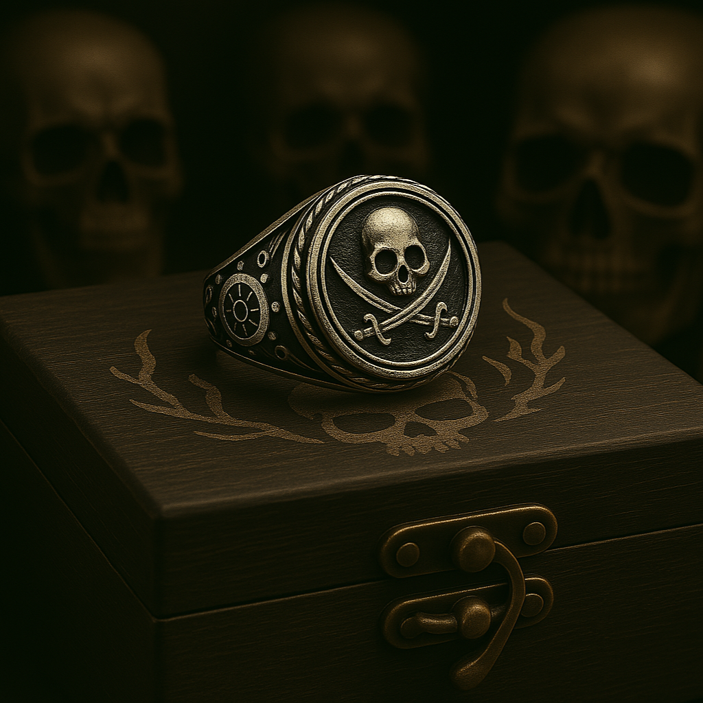 The Corsair’s Oath ring is more than an accessory—it's a relic of rebellion. Forged in the spirit of the high seas, this bold statement piece channels the fearless legacy of pirate captains and cursed crews who lived free and died legendary.