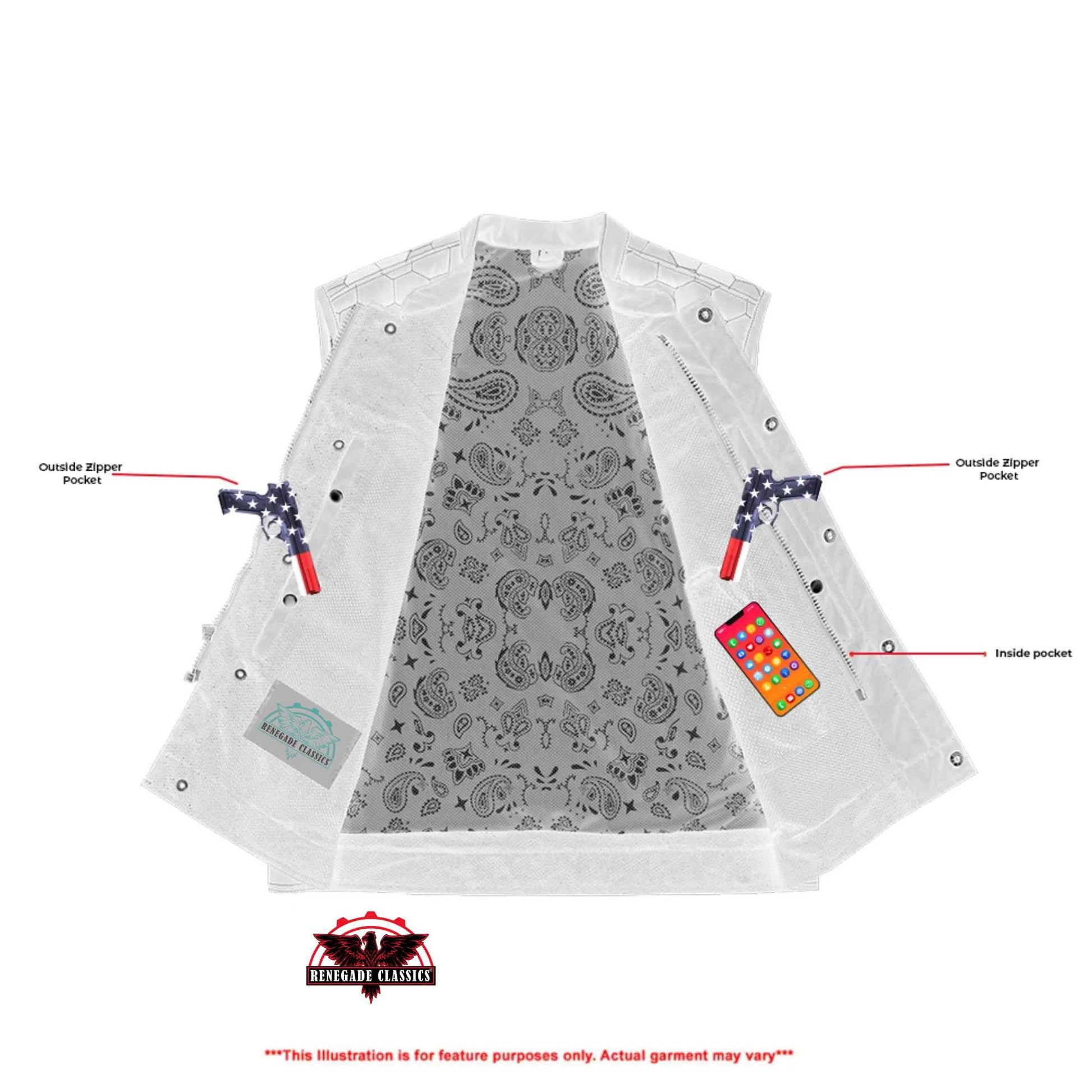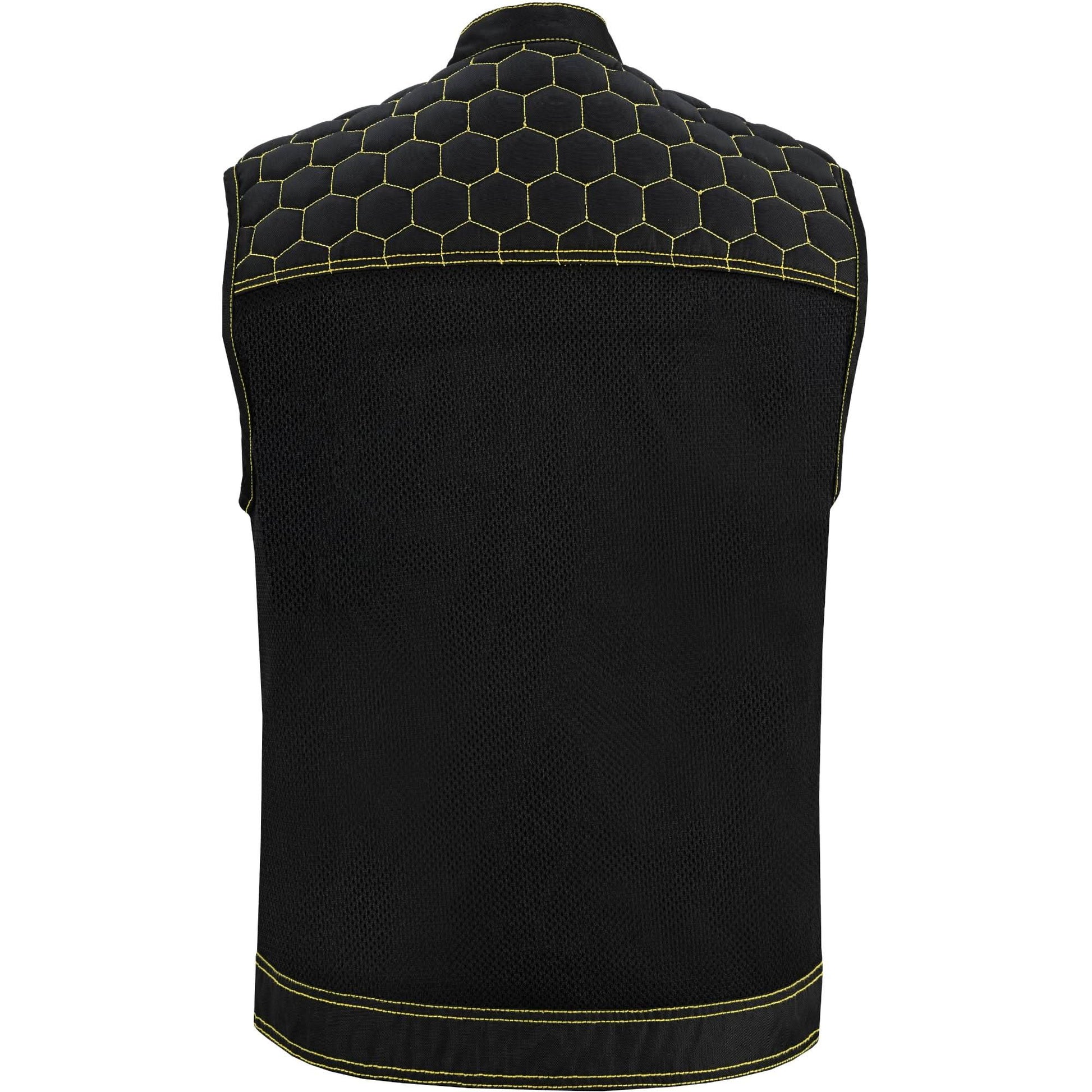 Our Gloom Gold Black and Yellow Mesh Textile Vest features a durable mesh construction with vibrant yellow accents. It includes concealed carry and secure chest pockets with snap button closures for convenience. The hidden front zipper with snap-placket reinforced stitching and built-in hanging loop adds to its practicality and style. This vest is perfect for those who want a striking, functional Vest to match their riding styles.