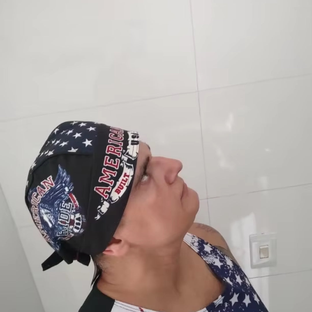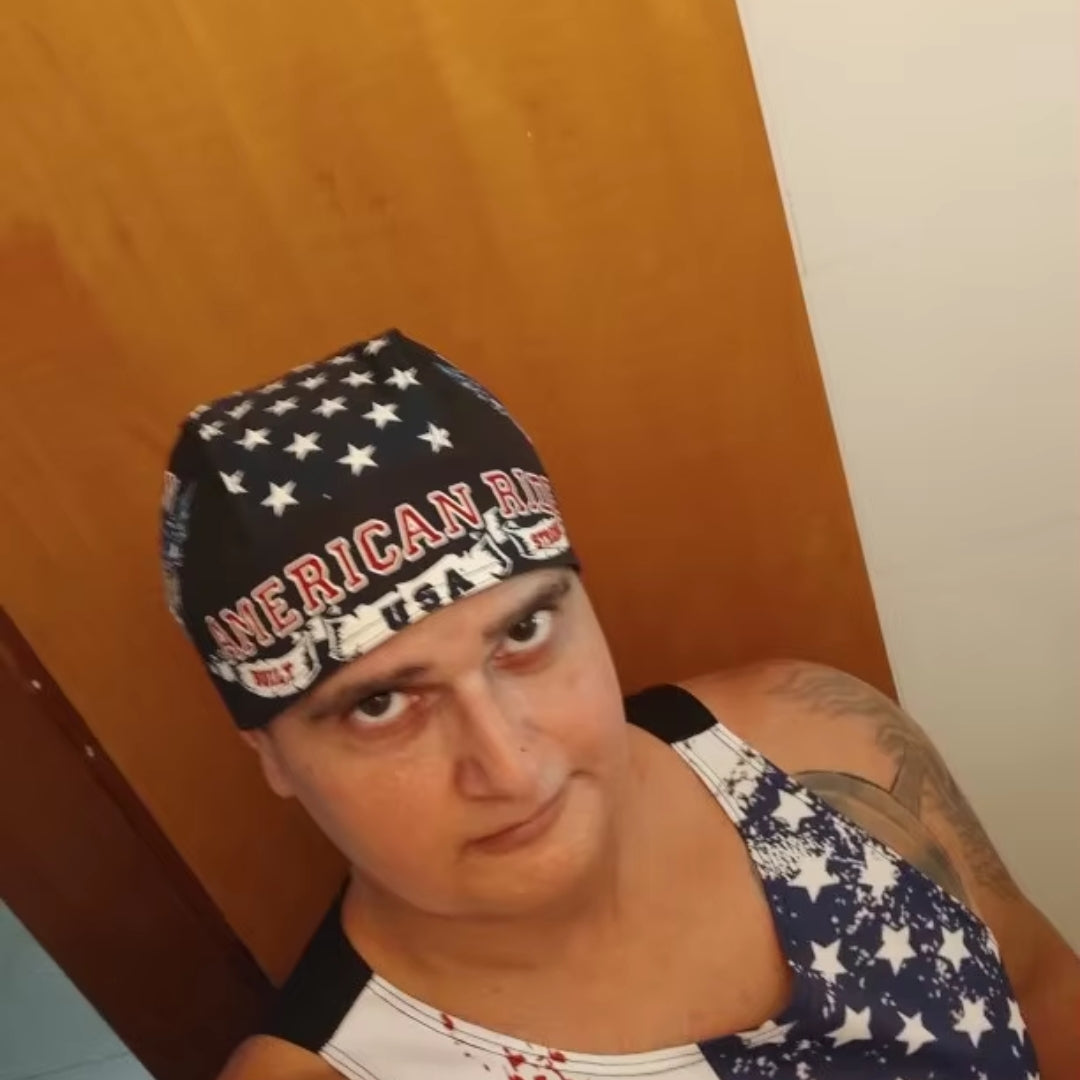 Show off your American pride with this bold and iconic “American Ride” Skull Cap, featuring original screen-printed artwork of a fierce bald eagle and the patriotic slogan ""American Ride, Built USA Strong."" Whether you’re on the open road or hitting the gym, this headwrap delivers performance and attitude in equal measure.