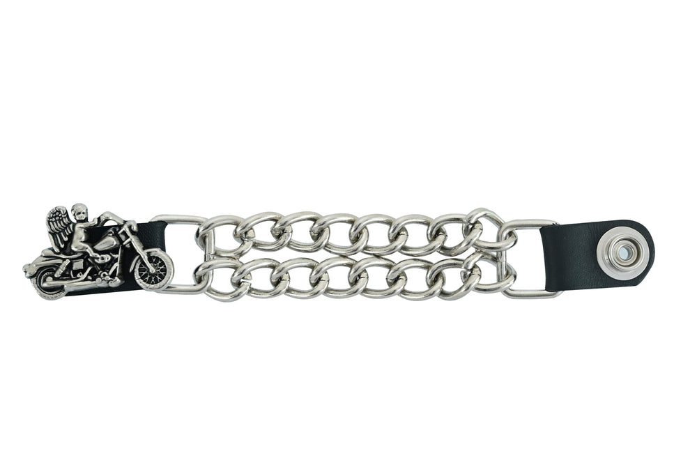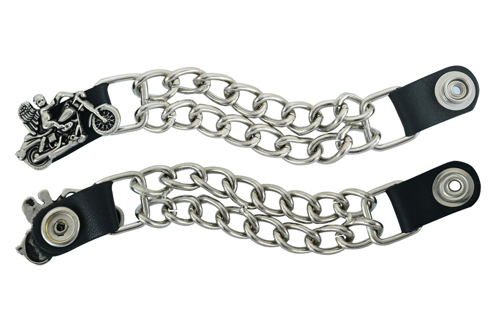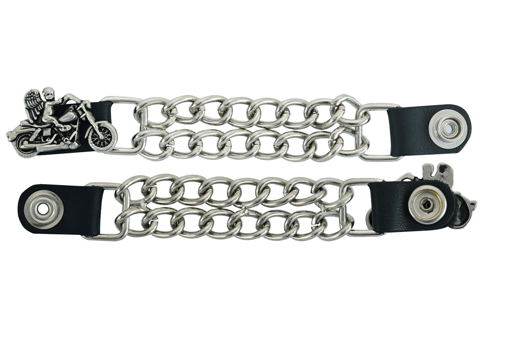 The vest extender also features a chrome motorcycle chain design, giving it a rugged and stylish look.