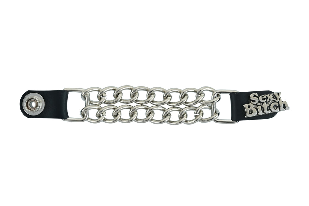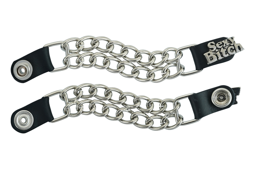 The vest extender also features a chrome motorcycle chain design, giving it a rugged and stylish look.